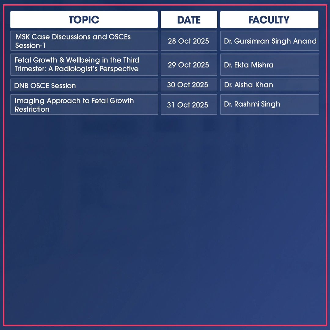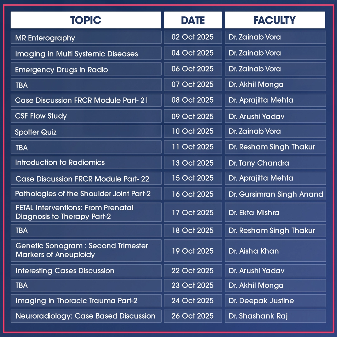 Sub-specialities of Radiology would be covered system-wise with theory as well as clinical case-based teaching. The focus would be on learning the correct approach to various cases useful for the exam as well as reporting in practice. Neuroradiology, Head and neck imaging, Thoracic Radiology, Abdominal Radiology, Uro-radiology, Women’s imaging, Fetal imaging, MSK Radiology, Pediatric Radiology, Interventional Radiology, Nuclear medicine would be included under this section.
